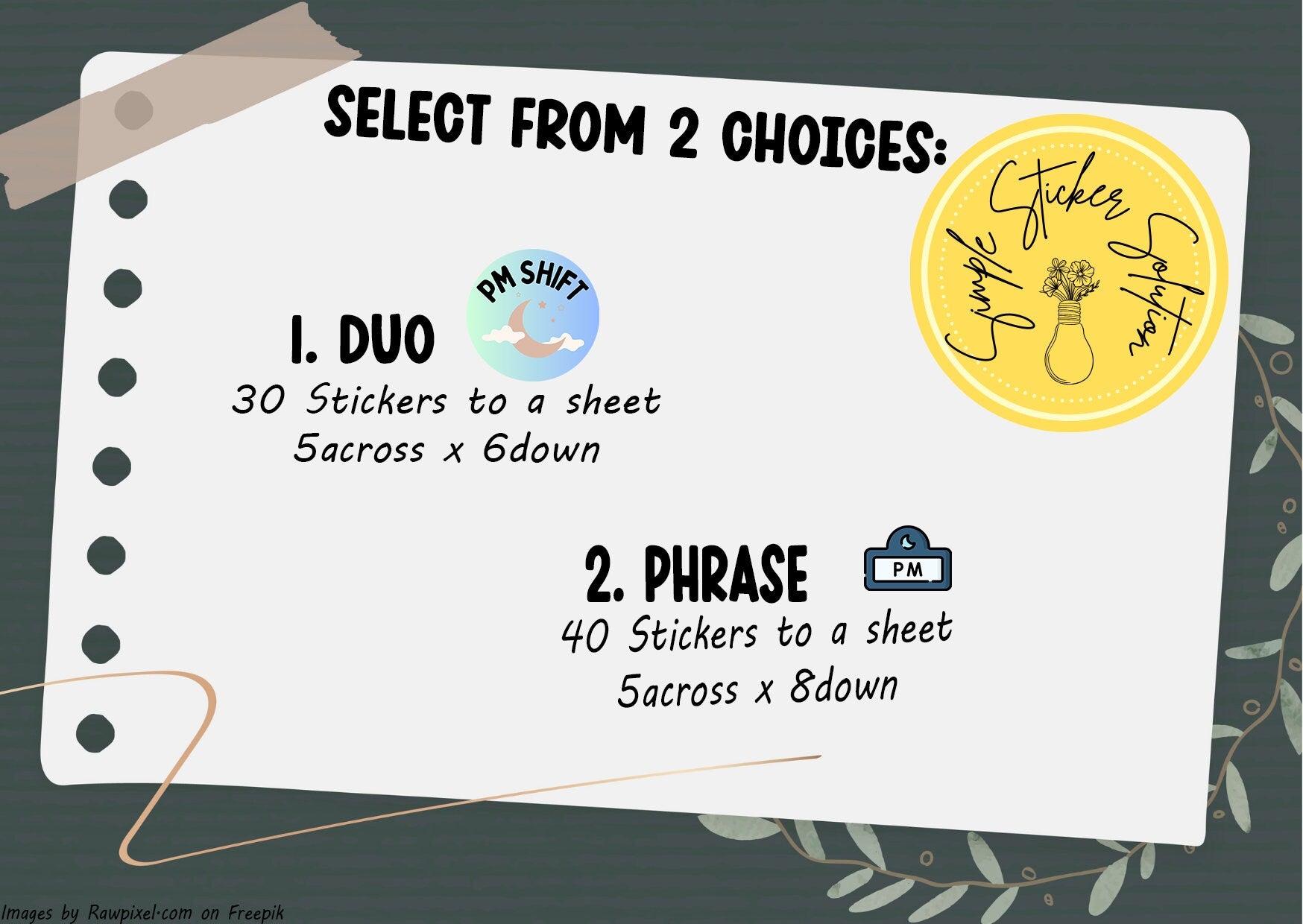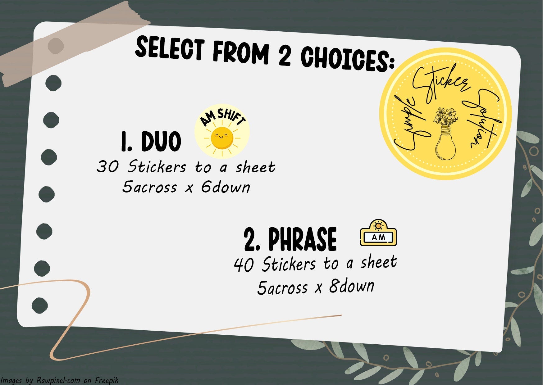 Each sheet includes 30 Duo of Icon & Phrase, each sticker measures 1.4cm diameter OR 40 Phrase, each sticker measuring 1.4cm (w) x 1cm (h) OR 56 Icon, each sticker measuring 1cm (w) x 1cm (h).